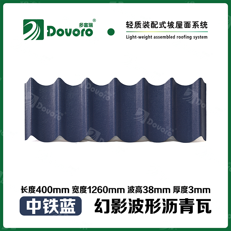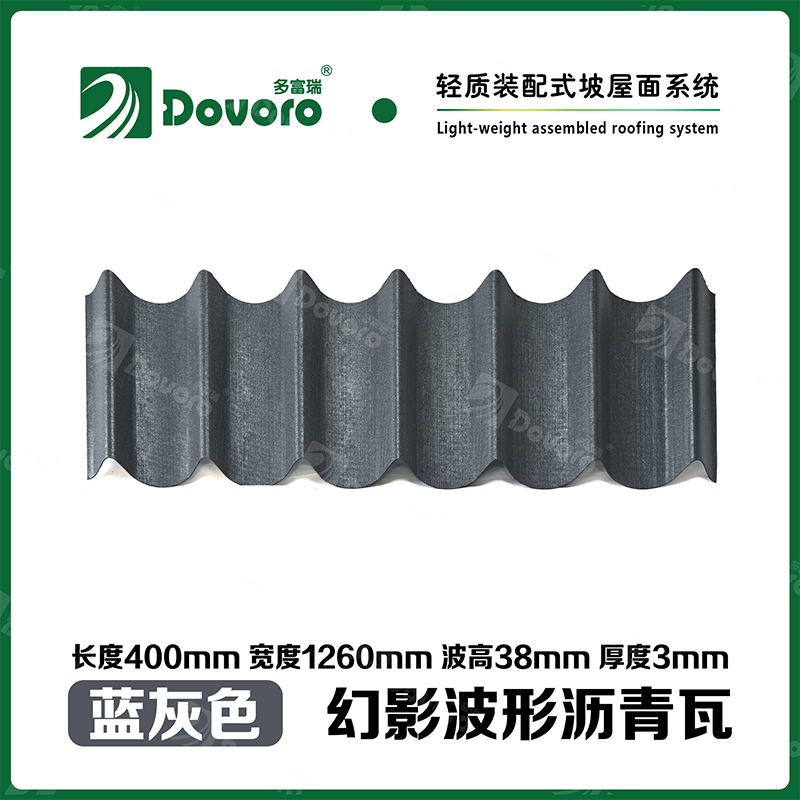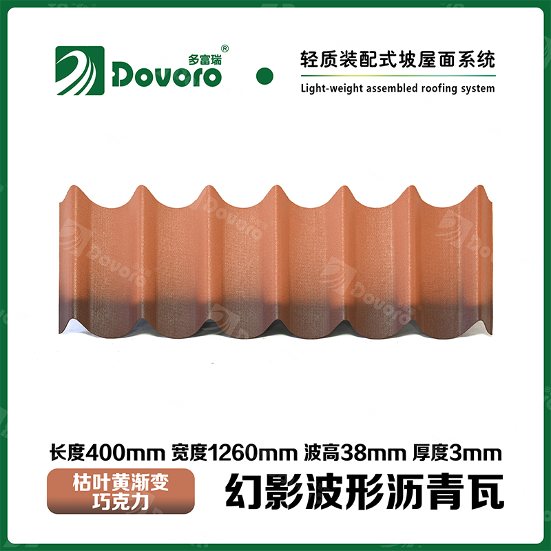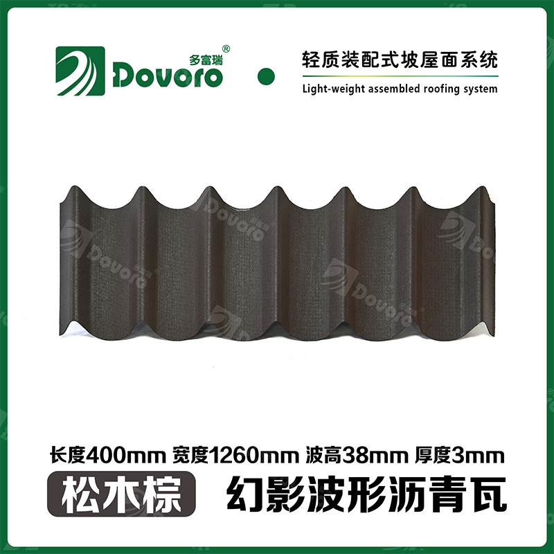 多富瑞幻影波形沥青瓦是由矿植物纤维板经过整形后浸渍沥青而成,一次成型的基层板在高温下浸渍沥青,使瓦材整体性更加牢固;热固性树脂保证了瓦材的强度和刚度;进口原料配合先进的着色工艺确保颜色持久、混色喷涂工艺使瓦材外观高雅、色彩美观、立体质感。