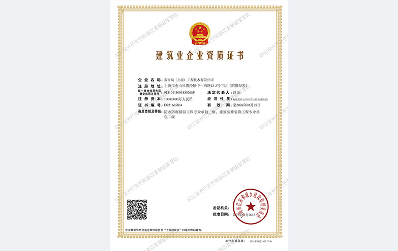 多富瑞(上海)工程技术有限公司 获得防水防腐保温工程专业承包二级、 建筑装修装饰工程专业承包二级资质